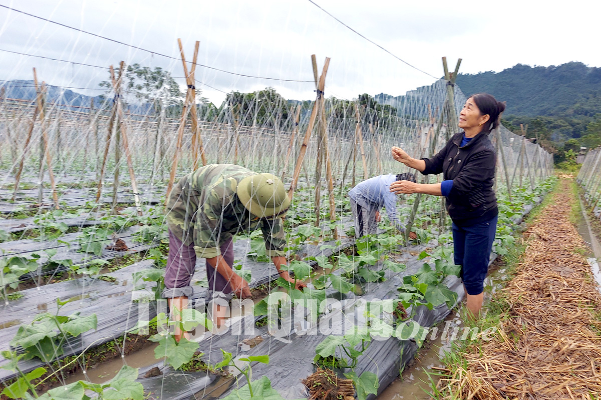 Bí thư Chi bộ thôn Khuân Nhự (phải) tiên phong đưa cây dưa chuột vào trồng trong thôn.