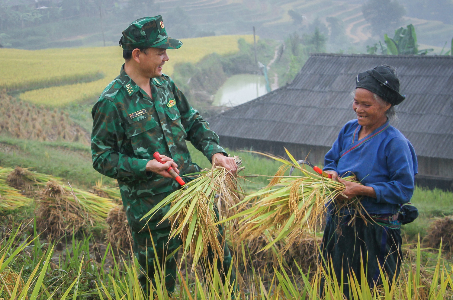 Cán bộ, chiến sĩ Đồn Biên phòng Thàng Tín (xã Pố Lồ, huyện Hoàng Su Phì, tỉnh Hà Giang) giúp đồng bào thu hoạch lúa_Ảnh: TTXVN