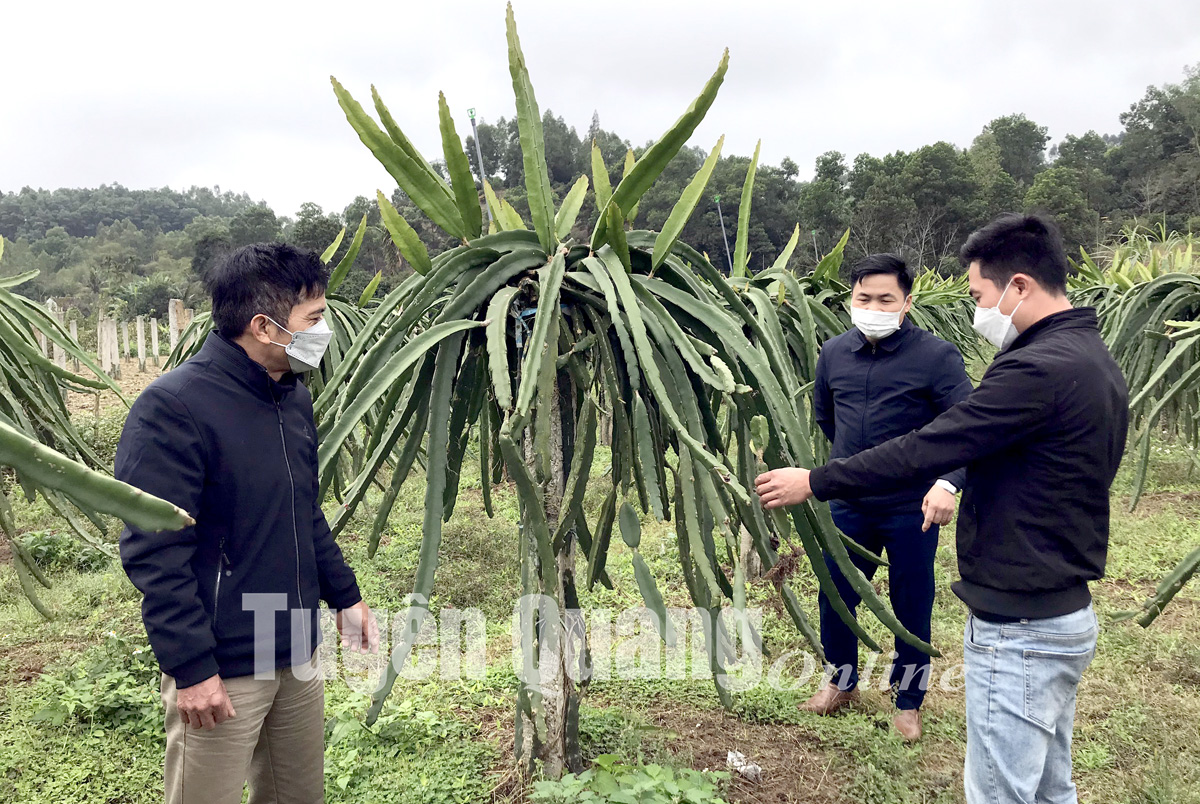Lãnh đạo xã Sơn Nam tham quan mô hình sản phẩm OCOP trồng cây thanh long ruột đỏ của anh Trần Văn thịnh, Giám đốc HTX Hưng Thịnh, thôn Cây Cọ.