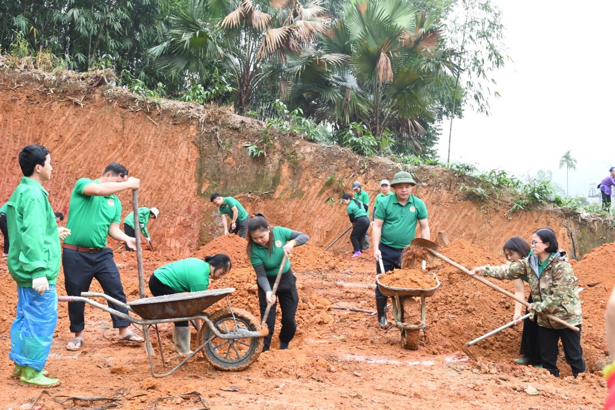 Cán bội Hội Nông dân các cấp hỗ trợ ngày công lao động xây dựng nhà mới cho hội viên nông dân ở xã Yên Sơn.