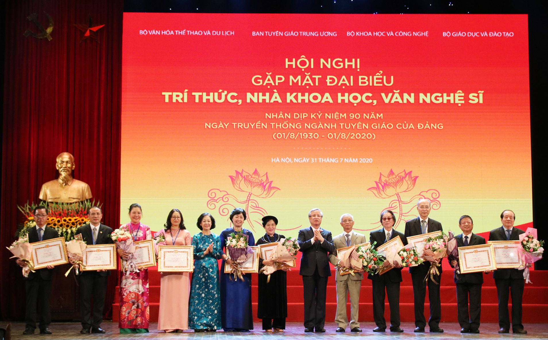 Đồng chí Trần Quốc Vượng, Ủy viên Bộ Chính trị, Thường trực Ban Bí thư và đồng chí Trương Thị Mai, Ủy viên Bộ Chính trị, Bí thư Trung ương Đảng, Trưởng ban Dân vận Trung ương trao tặng Bằng khen cho các văn nghệ sỹ, nhà khoa học, trí thức tiêu biểu năm 2020.