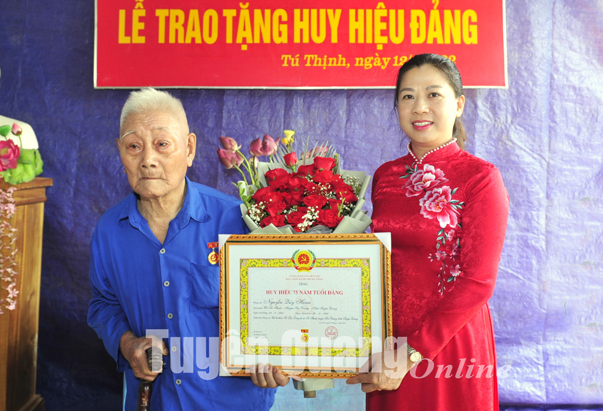 Sáng nay 12-7, đồng chí Lê Thị Kim Dung, Phó Bí thư Thường trực Tỉnh ủy, Chủ tịch HĐND tỉnh đã trao Huy hiệu 75 tuổi Đảng cho đảng viên Nguyễn Quý Hoan, sinh năm 1924, Chi bộ thôn Tú Tạc, Đảng bộ xã Tú Thịnh (Sơn Dương).