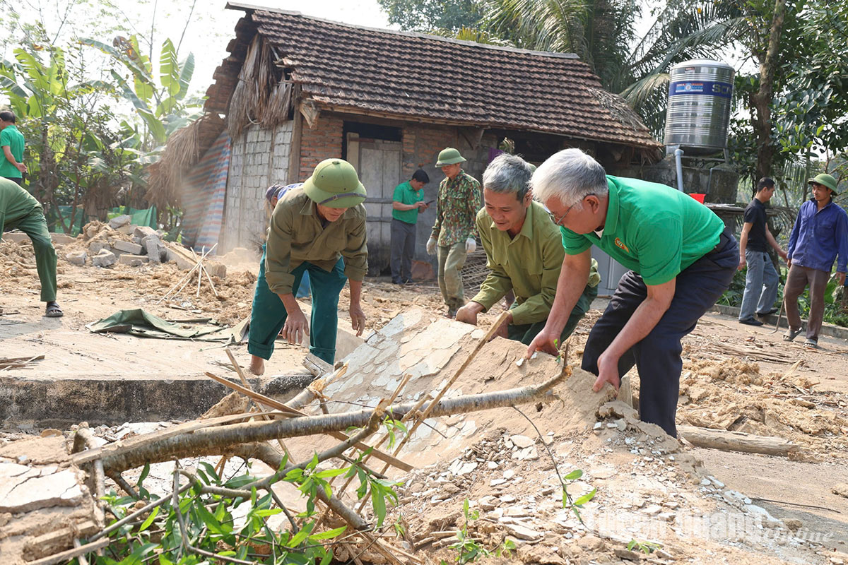 Cán bộ, hội viên nông dân xã Mỹ Bằng (Yên Sơn) giúp đỡ gia đình bà Hoàng Thị Bộ, thôn Đình Bằng tháo dỡ nhà tạm.