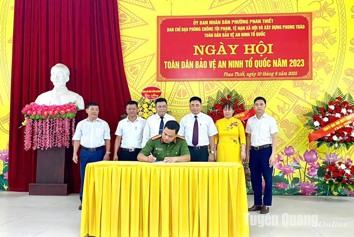 Lãnh đạo Công an phường Phan Thiết ký giao ước thi đua tại Ngày hội Toàn dân bảo vệ ANTQ năm 2023.