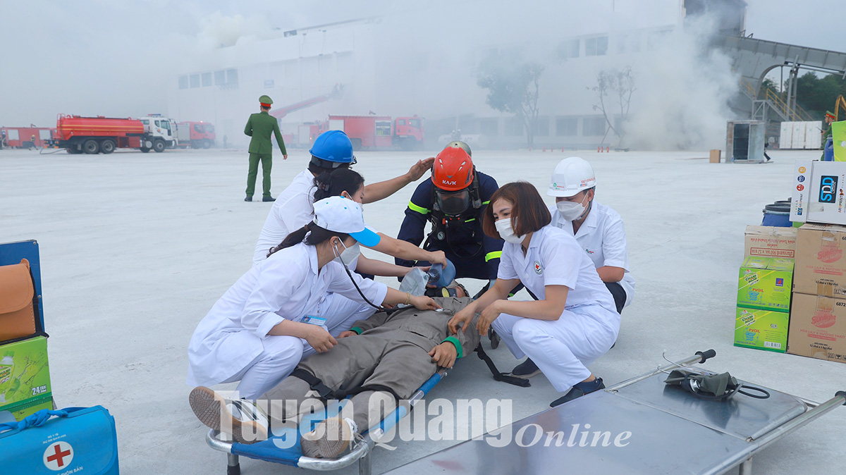 Cuộc diễn tập huy động nhiều lực lượng với 600 người, cùng 35 xe chuyên dụng các loại. Phần diễn tập thực binh theo tình huống giả định, xảy ra cháy tại phân xưởng giấy, Công ty cổ phần Giấy An Hòa do hệ thống điện bị chập, phát sinh các tia lửa điện bắn vào khu vực để giấy thành phẩm, đám cháy đã nhanh chóng lan rộng. Do tác động của ngọn lửa, nhiệt độ cao, khói khí độc và đám cháy phát triển nhanh khiến nhiều công nhân viên bị thương và mắc kẹt. Phần diễn tập được tiến hành qua 4 giai đoạn với các phương án xử lý tình huống cụ thể gồm: Giai đoạn 1 là lực lượng PCCC cơ sở và Đội PCCC chuyên ngành phát huy phương châm “4 tại chỗ” hướng dẫn thoát nạn, cứu người, cứu tài sản và tổ chức chữa cháy. Giai đoạn 2: Lực lượng Cảnh sát PCCC và cứu nạn, cứu hộ gần nhất và chính quyền địa phương tìm kiếm người bị nạn và ngăn chặn không để cháy lan, lực lượng chữa cháy chuyên nghiệp Phòng Cảnh sát PCCC và cứu nạn cứu hộ đến chi viện chữa cháy, cứu nạn, cứu hộ. Giai đoạn 3 là các đơn vị nghiệp vụ thuộc Công an tỉnh đến tham gia hỗ trợ công tác chữa cháy và cứu nạn, cứu hộ. Giai đoạn 4 là phát huy sức mạnh tổng hợp, đồng bộ giữa các đơn vị chữa cháy và cứu nạn, cứu hội tổ chức tìm kiếm nạn nhân, cấp cứu, tổ chức điều tra và khắc phục hậu quả vụ cháy.
