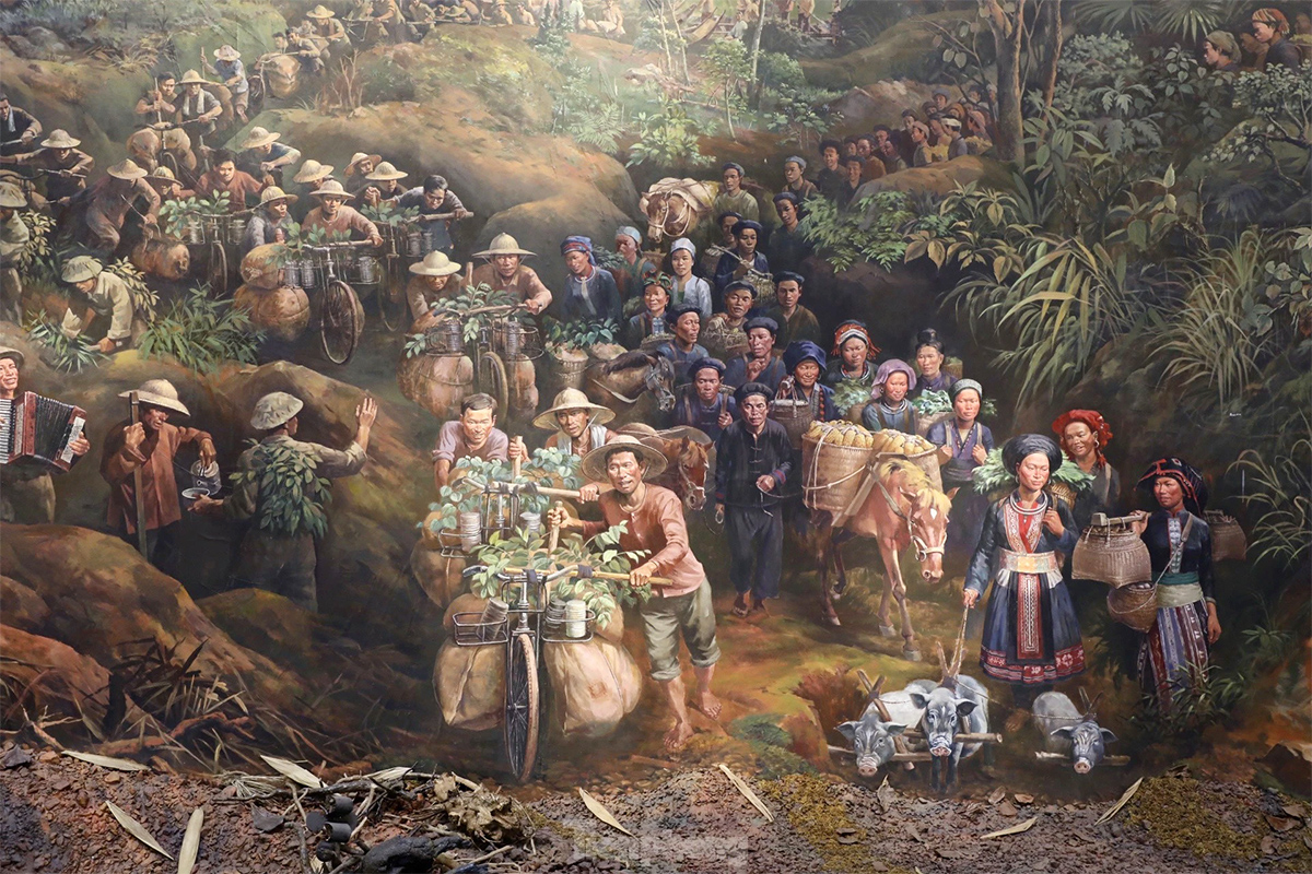 Bức tranh tái hiện hình ảnh trùng trùng các đoàn dân, quân thồ hàng, trèo non lội suối cung cấp lương thực cho Chiến dịch Điện Biên Phủ_Nguồn: tienphong.vn