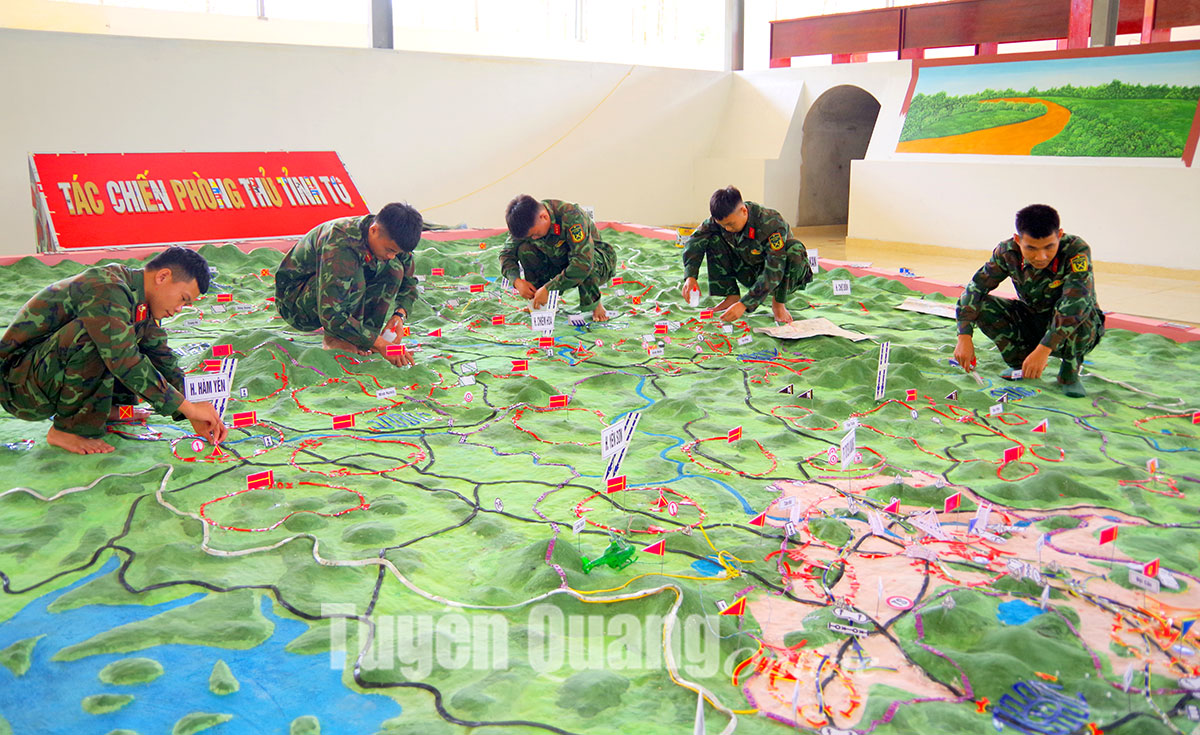 Bộ CHQS tỉnh đã chỉ đạo các cơ quan tập trung hoàn thiện sa bàn diễn tập. Trung tá Hà Xuân Thắng, Trưởng Ban Trinh sát Bộ CHQS tỉnh cho biết: Việc đắp sa bàn diễn tập là một nhiệm vụ rất khó khăn và phức tạp bởi từ thực tế thực địa vào đến sa bàn phải tính toán chuẩn xác, để bảo đảm đúng tỷ lệ; địa danh các xã, phường, thị trấn, trung tâm các huyện, thành phố phải bảo đảm đúng quy định. Do vậy trong quá trình đắp Sa bàn, cán bộ, nhân viên trong Ngành Trinh sát thực hiện một cách tỉ mỷ, làm đến đâu, chắc đến đó; các hệ thống đèn tín hiệu bố trí hợp lý để khi thực hành tác chiến phòng thủ trên sa bàn sát với trên thực tế. Cho đến nay, việc đắp sa bàn trong diễn tập đã được Ban Trinh sát Bộ CHQS tỉnh hoàn thiện, sẵn sàng phục vụ cho thực hành luyện tập và diễn tập KVPT tỉnh năm 2023.