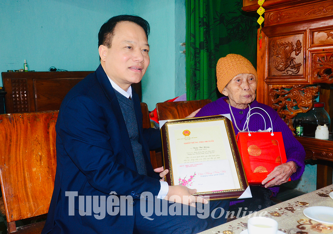 Đồng chí Vân Đình Thảo đã hỏi thăm, tặng quà của Chủ tịch nước và của tỉnh cho 3 cụ tròn 100 tuổi: Cụ Âu Thị Lai, thôn Văn Bảo, xã Sơn Nam; cụ Nguyễn Thị Tẹo, thôn Đồn Hang, xã Vân Sơn; cụ Trần Thị Nông, thôn Làng Đu, xã Văn Phú (Sơn Dương).