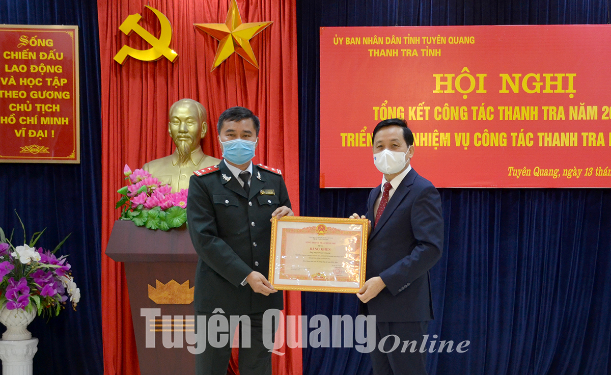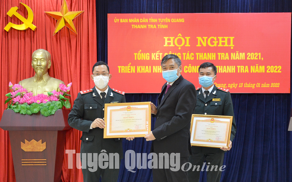 Nhân dịp này, Tổng Thanh tra Chính phủ đã tặng Bằng khen cho 2 tập thể, 2 cá nhân có thành tích xuất sắc trong công tác thanh tra năm 2021, Thanh tra tỉnh tặng Giấy khen cho 9 tập thể và 16 cá nhân đạt thành tích xuất sắc trong thực hiện nhiệm vụ năm 2021.