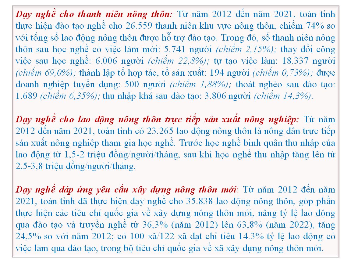 Chất lượng đào tạo nghề cho lao động nông thôn có chuyển biến tích cực, từ năm 2012 đến nay, toàn tỉnh có 39.589 lao động nông thôn có nhu cầu học nghề, trong đó đã tổ chức dạy nghề cho 35.838 người. Một bộ phận lao động nông thôn sau khi học nghề đã áp dụng kiến thức được đào tạo vào phát triển kinh tế hộ gia đình, nâng cao năng suất lao động, tiết kiệm được chi phí sản xuất, tăng thu nhập, ổn định cuộc sống, từng bước thay đổi tư duy của lao động nông thôn và giảm nghèo bền vững. Một số lao động có việc làm mới ở các doanh nghiệp, cơ sở sản xuất, được chuyển đổi nghề nghiệp, góp phần chuyển dịch cơ cấu lao động và cơ cấu kinh tế trong nông thôn, thực hiện xây dựng nông thôn mới. Một số mô hình dạy nghề, ứng dụng hiệu quả sau đào tạo đã được xây dựng và hoạt động ngày càng hiệu quả.
