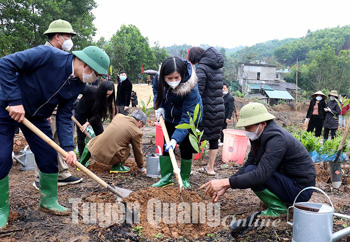 Sau lễ phát động, các đồng chí lãnh đạo tỉnh, các đại biểu đã cùng nhân dân, học sinh trồng 2 ha keo tại tổ dân phố Làng Chẩu, thị trấn Yên Sơn, mở đầu kế hoạch trồng mới 3.200 ha rừng sản xuất năm 2022 của huyện.