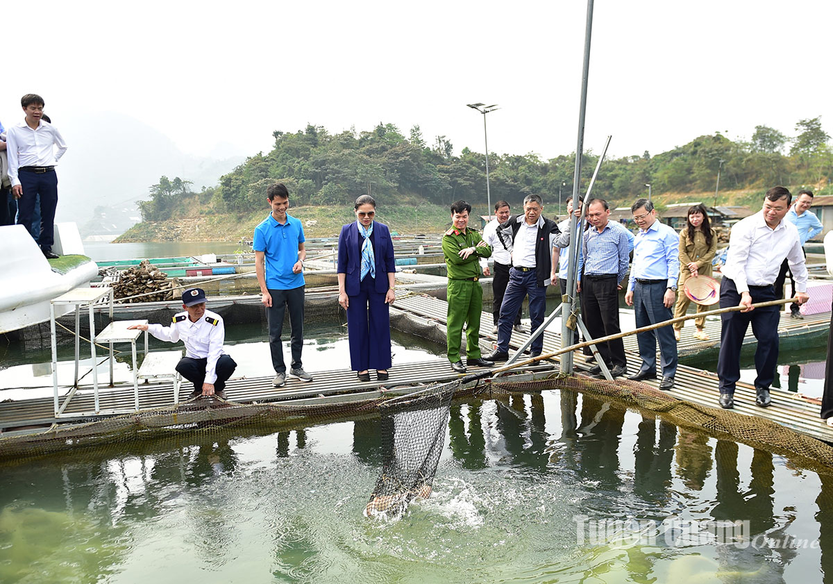 Khảo sát phát triển thủy sản trên lòng hồ tại Hợp tác xã thủy sản Na Hang hiện đang thực hiện nuôi trồng thủy sản theo Tiêu chuẩn VietGAP với 300 lồng, sản lượng ước đạt 50 tấn/năm, bao gồm cá đặc sản (cá bỗng, cá lăng chấm, cá tâm), cá chủ lực (cá nheo, cá lăng đen, cá chép, trăm, rô phi...), đồng chí Bí thư Tỉnh ủy đánh giá cao mô hình đã tận dụng tiềm năng để phát triển. Đồng chí đề nghị huyện tiếp tục quan tâm tạo mọi điều kiện thuận lợi để hợp tác xã mở rộng quy mô sản xuất. Đồng thời khuyến khích phát triển thêm nhiều hợp tác xã trên địa bàn. Đồng chí cũng lưu ý quá trình khai thác, chăn nuôi cần đảm bảo các yêu cầu về môi trường.