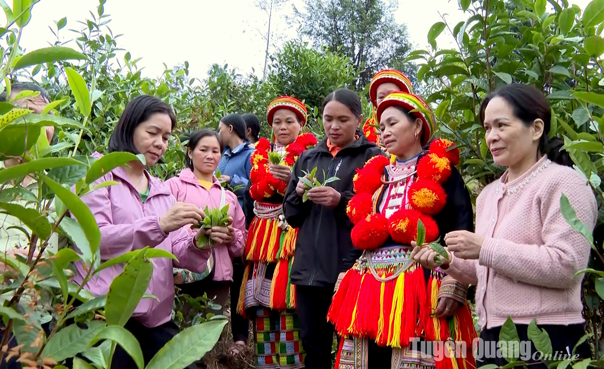 Cán bộ Hội Nông nghiệp hữu cơ tỉnh hướng dẫn người dân thôn Phia Chang, Nà Cọn, xã Sơn Phú (Na Hang) quy trình chăm sóc chè theo tiêu chuẩn PGS.