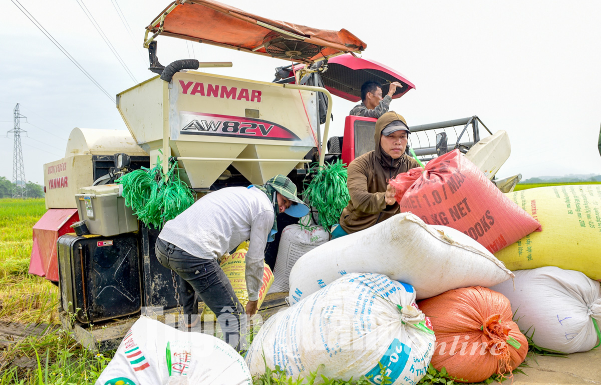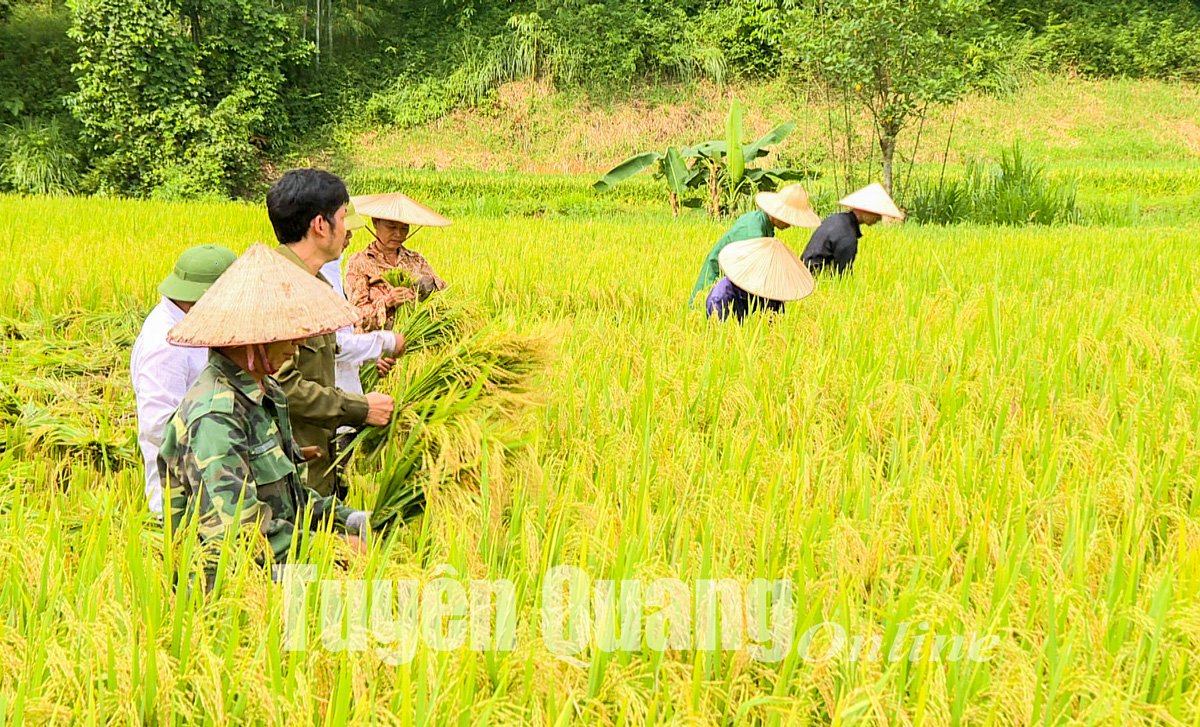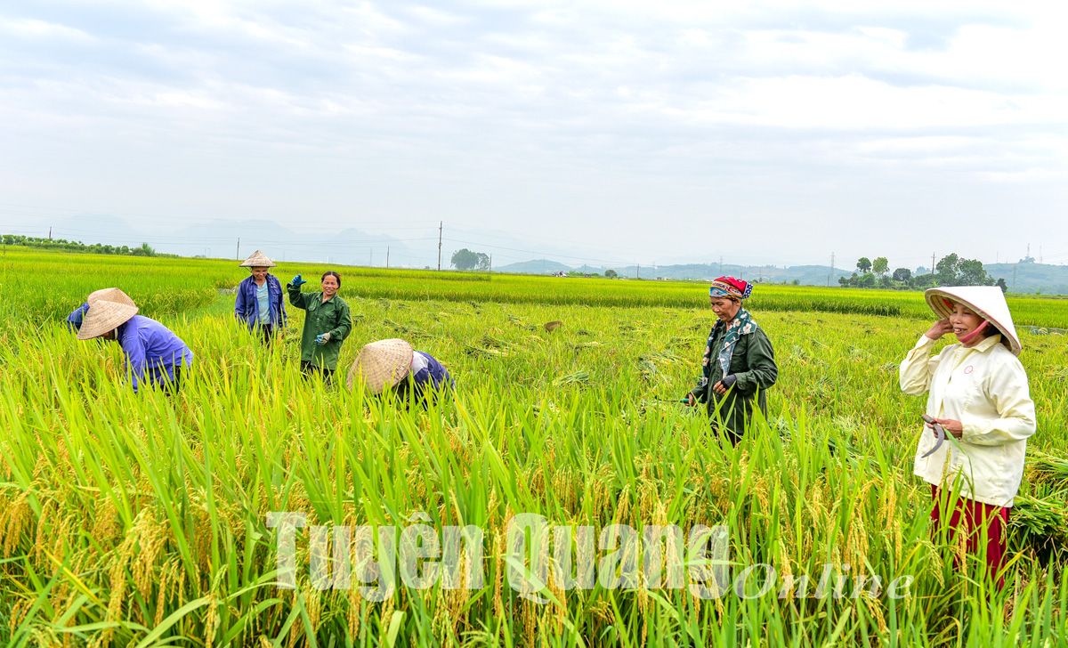 Người dân xã Hùng Mỹ (Chiêm Hóa) hối hả thu hoạch lúa xuân.