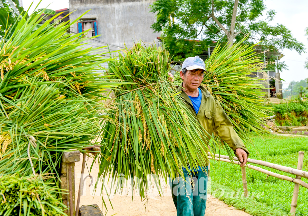 Lúa được tuốt ngay tại ruộng, người dân chỉ việc vận chuyển về nhà phơi.