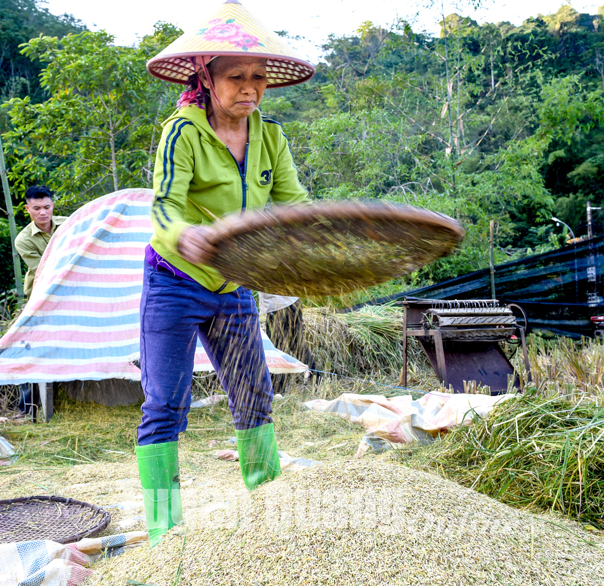 Người dân xã Thượng Nông (Na Hang) thu hoạch lúa xong, tuốt luôn tại chân ruộng.