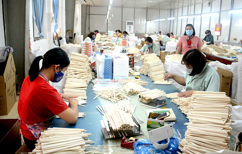 Công nhân phân loại, đóng gói sản phẩn đũa gỗ tách của Công ty cổ phần Thương mại - Sản xuất xuất khẩu Phúc Lâm.