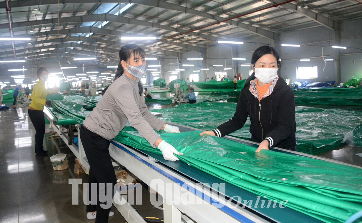 Nhận thức sâu sắc điều này, các cơ quan chức năng của tỉnh, chính quyền các địa phương đã tạo môi trường tốt nhất cho các doanh nghiệp, người dân thi đua lao động sản xuất. Từ sự quan tâm đó, các doanh nghiệp đã chủ động triển khai kế hoạch sản xuất, kinh doanh ngay từ đầu năm mới. 7 giờ sáng 6 - 2, trước một ngày so với quy định nghỉ Tết Nguyên đán Nhâm Dần 2022, hàng nghìn công nhân tại Cụm công nghiệp Phúc Ứng (Sơn Dương) tham gia thực hiện các biện pháp phòng dịch bệnh Covid-19 như khử trùng, sát khuẩn, đo thân nhiệt để chuẩn bị vào ngày làm việc đầu tiên sau một tuần nghỉ Tết. Anh Bùi Văn Hưng, Quản lý sản xuất của Công ty sản xuất bao bì DHT cho biết, bước vào năm 2022, công ty đã có đơn hàng 10 nghìn sản phẩm xuất khẩu nên công ty tổ chức sản xuất từ mùng 6 -2 đảm bảo đơn hàng đã ký. Dẫu công ty mới đi vào sản xuất quý III-2021 nhưng đã xuất khẩu sang các nước châu Á được 150 tấn sản phẩm, thu nhập bình quân người lao động từ 7 triệu trở lên.