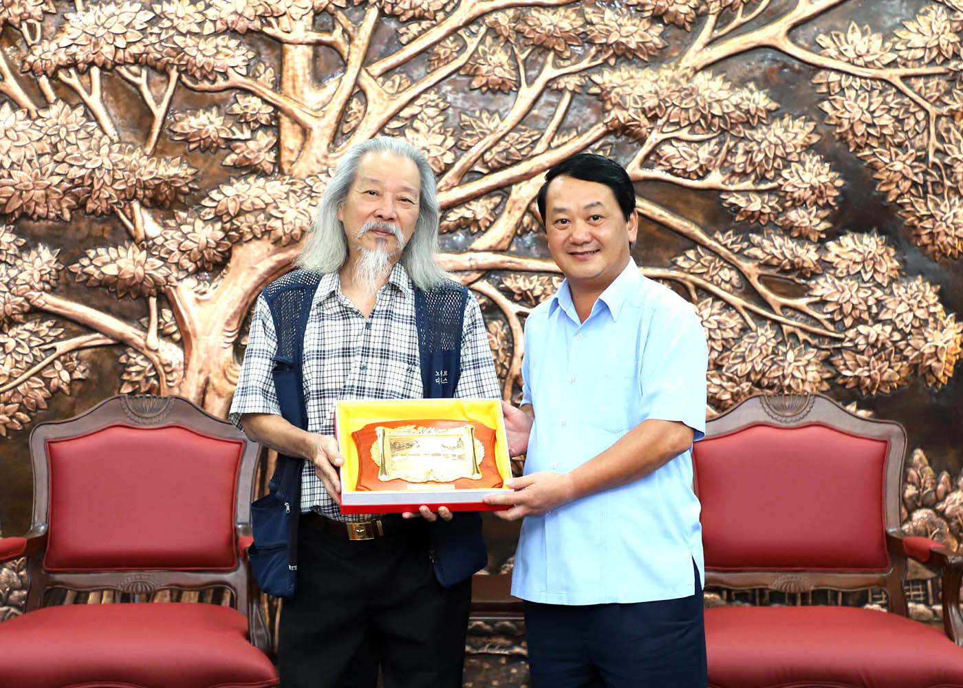 Đồng chí nhấn mạnh: “Đây là món quà vô cùng quý giá, không chỉ mang giá trị lịch sử - nghệ thuật đặc biệt, mà còn là biểu tượng thiêng liêng của tinh thần yêu nước, niềm tự hào dân tộc và khát vọng độc lập, tự do. Chúng tôi trân trọng đón nhận hiện vật này với lòng biết ơn sâu sắc, và cam kết sẽ bảo quản, gìn giữ, phát huy giá trị để phục vụ công tác giáo dục truyền thống cách mạng, hun đúc lòng yêu nước cho thế hệ trẻ.”
