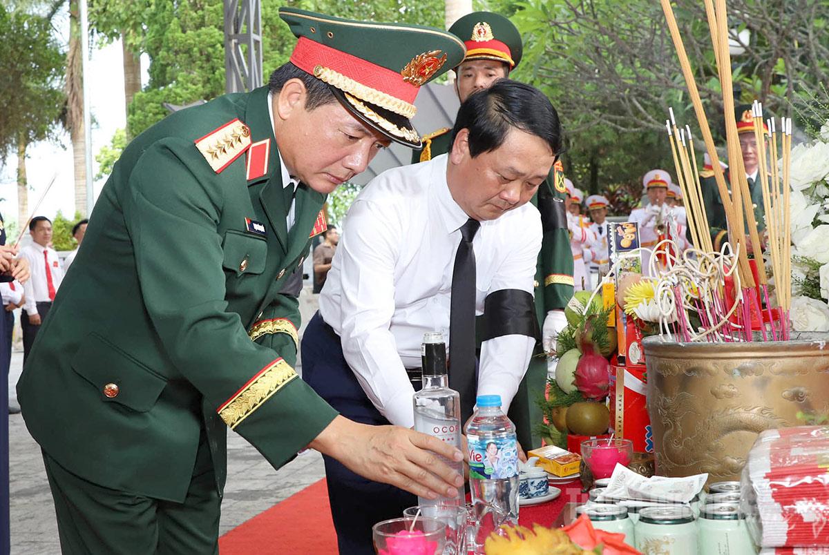| Đại tướng Trịnh Văn Quyết, Bí thư Tỉnh ủy Hầu A Lềnh thực hiện nghi thức di chuyển hài cốt các Anh hùng Liệt sĩ về nơi an táng. |