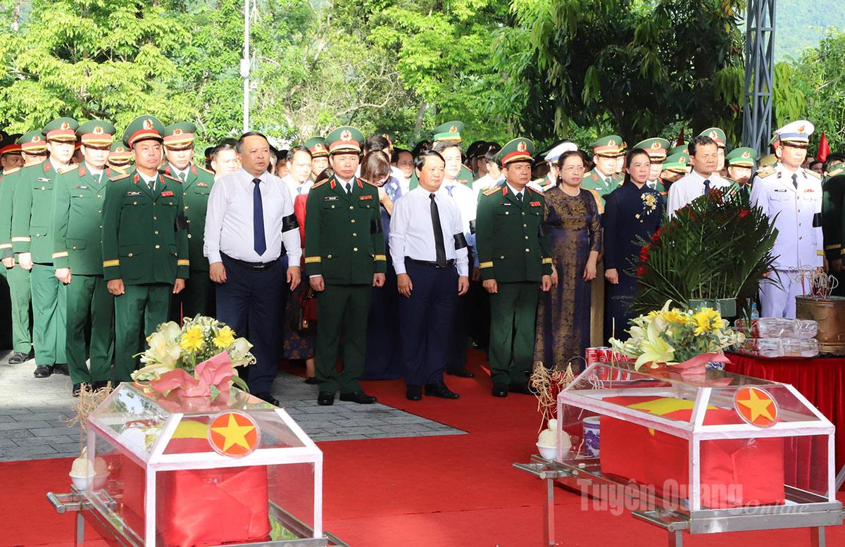 Trong tiếng nhạc du dương, lời bài hát xúc động của ca khúc “Đón các anh về”, các đại biểu đã thực hiện nghi thức di chuyển hài cốt các Anh hùng liệt sĩ về an táng tại Nghĩa trang Liệt sĩ Quốc gia Vị Xuyên và thắp hương lên các phần mộ các Anh hùng liệt sĩ vừa được quy tập, an táng.