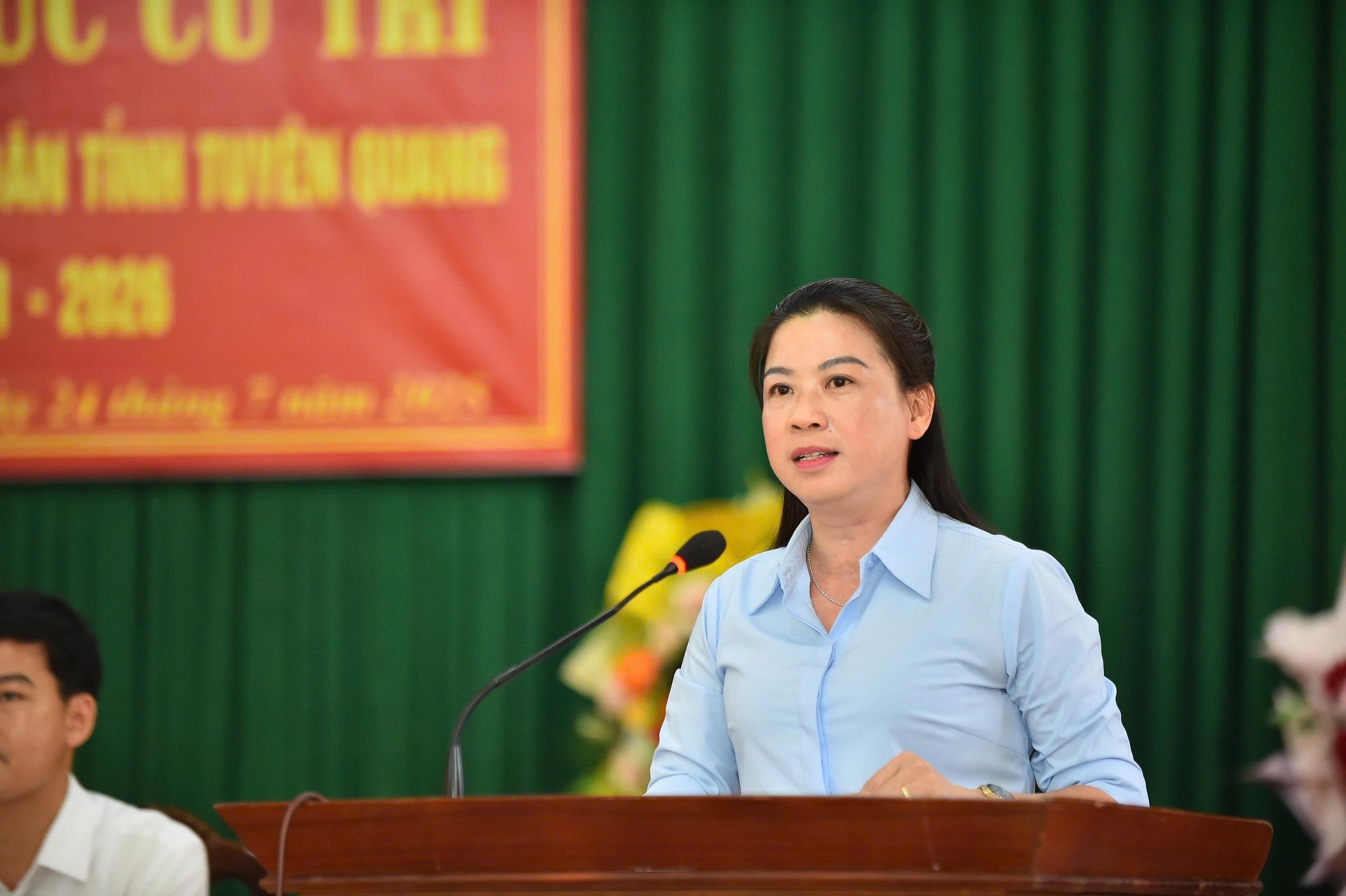 Đồng chí Phó Bí thư Thường trực Tỉnh ủy Lê Thị Kim Dung nói chuyện với cán bộ và cử tri xã Yên Phú.