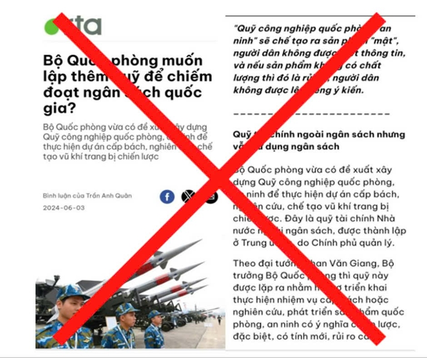 Việc thành lập Quỹ Công nghiệp quốc phòng, an ninh (QPAN) là chủ trương đúng đắn nhằm hỗ trợ ngân sách nhà nước phục vụ cho phát triển công nghiệp QPAN để chủ động bảo vệ vững chắc Tổ quốc. Song, trên một vài trang mạng xã hội vẫn có thông tin cố tình xuyên tạc, bóp méo chủ trương này với âm mưu phá vỡ sự đồng thuận xã hội, gây mất niềm tin vào Đảng, Nhà nước, Quân đội hòng phục vụ mưu đồ đen tối của các thế lực thù địch, phản động.