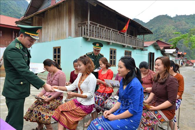 Cán bộ Đồn Biên phòng Pa Thơm tuyên truyền các chủ trương của Đảng, chính sách của Nhà nước cho bà con người dân tộc Lào tại bản Pa Xa Lào, xã biên giới Pa Thơm, huyện Điện Biên.