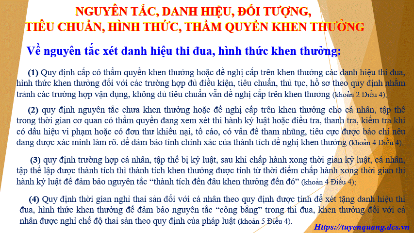 Về nguyên tắc xét danh hiệu thi đua, hình thức khen thưởng: (i) Quy định cấp có thẩm quyền khen thưởng hoặc đề nghị cấp trên khen thưởng các danh hiệu thi đua, hình thức khen thưởng đối với các trường hợp đủ điều kiện, tiêu chuẩn, thủ tục, hồ sơ theo quy định nhằm tránh các trường hợp vận dụng, không đủ tiêu chuẩn vẫn đề nghị cấp trên khen thưởng (khoản 2 Điều 4); (ii) quy định nguyên tắc chưa khen thưởng hoặc đề nghị cấp trên khen thưởng cho cá nhân, tập thể trong thời gian cơ quan có thẩm quyền đang xem xét thi hành kỷ luật hoặc điều tra, thanh tra, kiểm tra khi có dấu hiệu vi phạm hoặc có đơn thư khiếu nại, tố cáo, có vấn đề tham nhũng, tiêu cực được báo chí nêu đang được xác minh làm rõ. để đảm bảo tính chính xác của thành tích đề nghị khen thưởng (khoản 4 Điều 4); (iii) quy định trường hợp cá nhân, tập thể bị kỷ luật, sau khi chấp hành xong thời gian kỷ luật, cá nhân, tập thể lập được thành tích thì thành tích khen thưởng được tính từ thời điểm chấp hành xong thời gian thi hành kỷ luật để đảm bảo nguyên tắc “thành tích đến đâu khen thưởng đến đó” (khoản 4 Điều 4); (iv) Quy định thời gian nghỉ thai sản đối với cá nhân theo quy định được tính để xét tặng danh hiệu thi đua, hình thức khen thưởng để đảm bảo nguyên tắc “công bằng” trong thi đua, khen thưởng đối với cá nhân được nghỉ chế độ thai sản theo quy định của pháp luật (khoản 5 Điều 4).