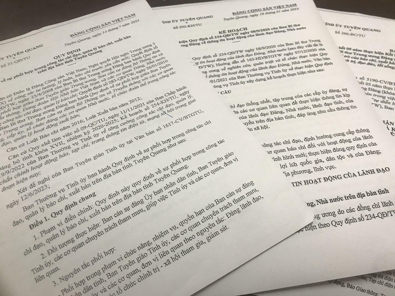 Ban Tuyên giáo Tỉnh ủy đã chủ động tham mưu cho Ban Thường vụ ban hành Quy định số 21-QĐ/TU, ngày 14/7/2023 quy định về sự phối hợp trong công tác chỉ đạo, quản lý báo chí, xuất bản trên địa bàn tỉnh Tuyên Quang; Kế hoạch số 292-KH/TU, ngày 18/01/2023 về thực hiện Quy định số 234-QĐ/TW ngày 08/9/2020 của Ban Bí thư Trung ương Đảng về thông tin hoạt động của lãnh đạo Đảng, Nhà nước; Kế hoạch số 330-KH/TU ngày 11/4/2023 về hưởng ứng Giải báo chí toàn quốc về xây dựng Đảng (Giải Búa liềm vàng) lần thứ VIII-năm 2023; Báo cáo số 339-BC/TU, ngày 31/10/2023 về tổng kết 10 năm thực hiện Chỉ thị số 30-CT/TW, ngày 25/12/2023 của Bộ Chính trị về phát triển và tăng cường quản lý báo chí điện tử, mạng xã hội và các loại hình truyền thông khác trên Internet; Báo cáo số 266-BC/TU ngày 17/6/2023 về việc sơ kết 05 năm thực hiện Kết luận số 23-KL/TW, ngày 22/11/2017 của Ban Bí thư Trung ương Đảng (khóa XII) về tăng cường chỉ đạo, quản lý, phát huy vai trò của báo chí, xuất bản trong việc ngăn chặn, đẩy lùi sự suy thoái về tư tưởng chính trị, đạo đức, lối sống, “tự diễn biến”, “tự chuyển hóa” trong nội bộ…